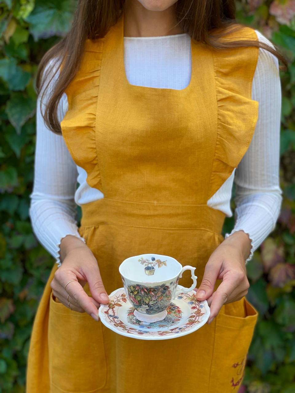 Жіночий фартух з рюшем та фірмовою вишивкою на кармані у сірому кольорі (Фартух)